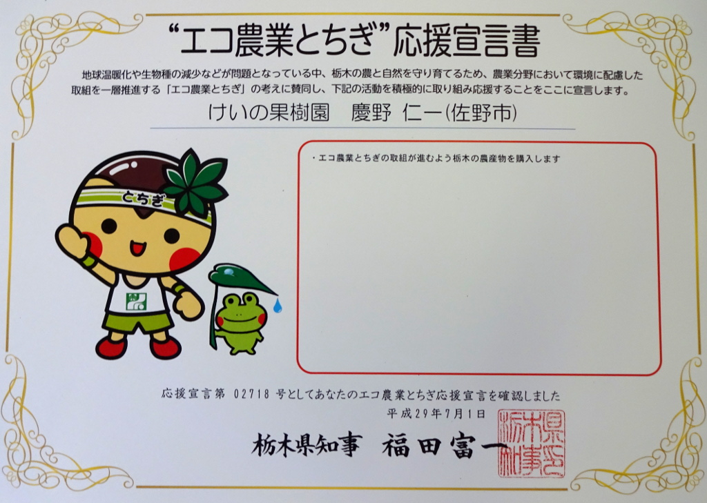 けいの果樹園ではエコ農業とちぎ 実施宣言・応援宣言しています!